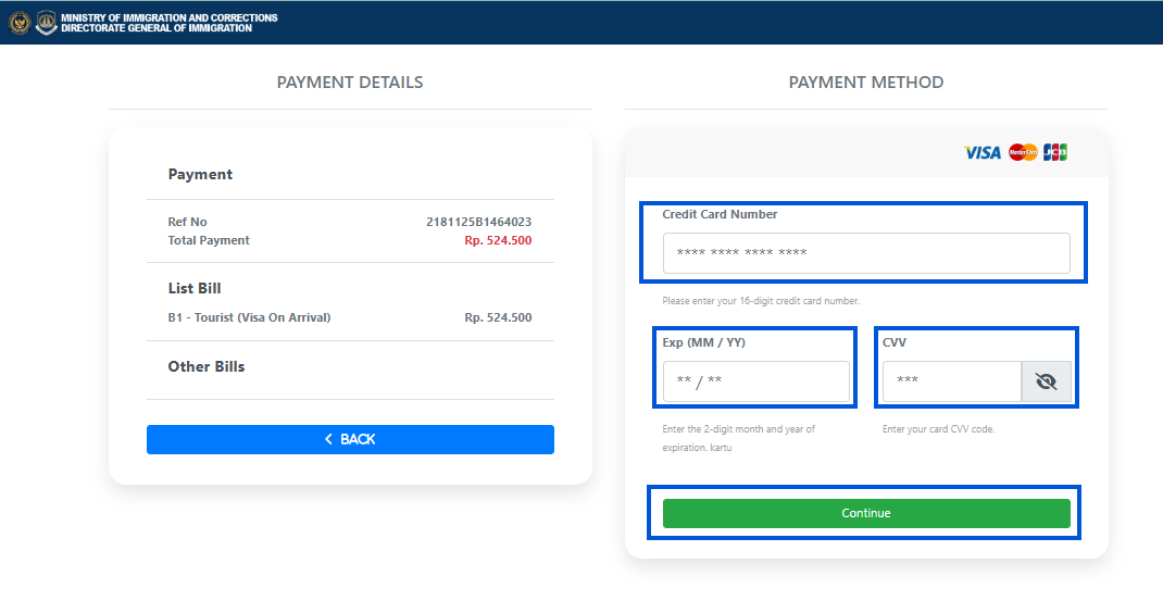 ビザの申請と料金の支払い(IDR 500,000(約4,500円)のクレジットカード決済)