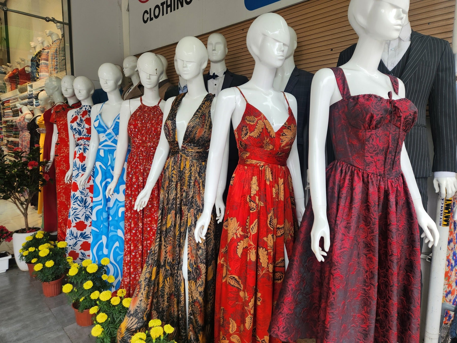 店頭にずらりと並ぶ反物は、艶めくホイアンシルク、涼やかなリネン、クラシックなウール混などバリエーション豊富。